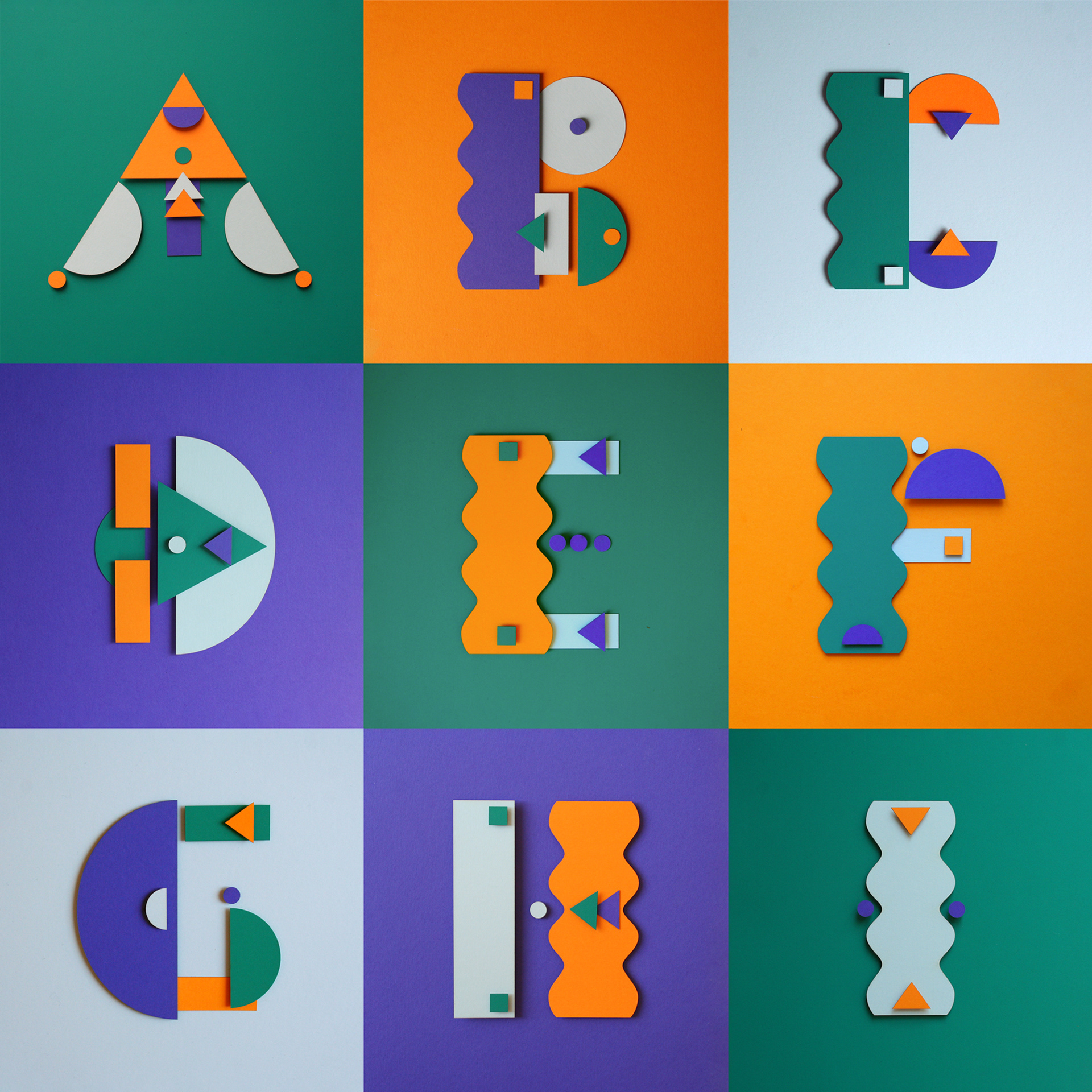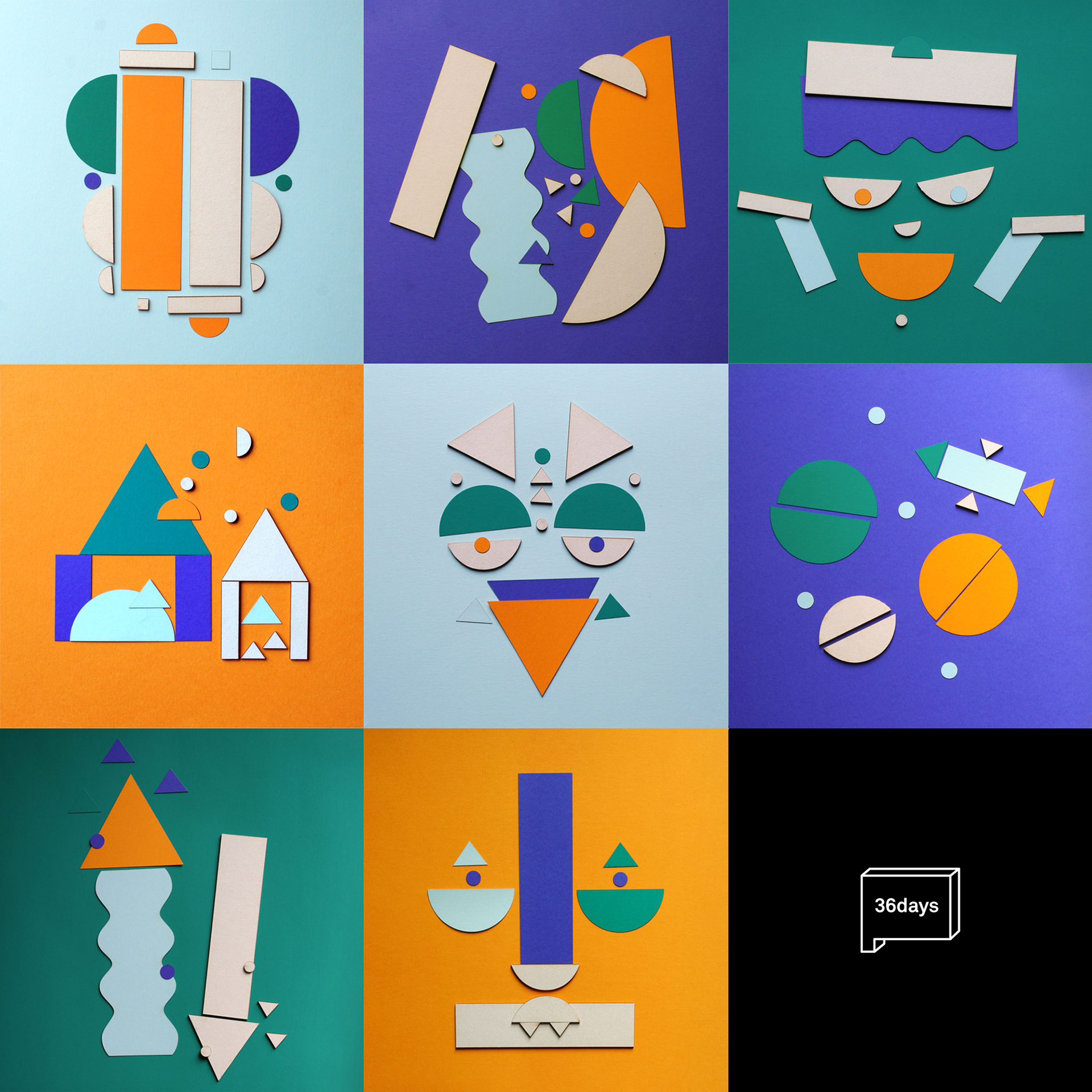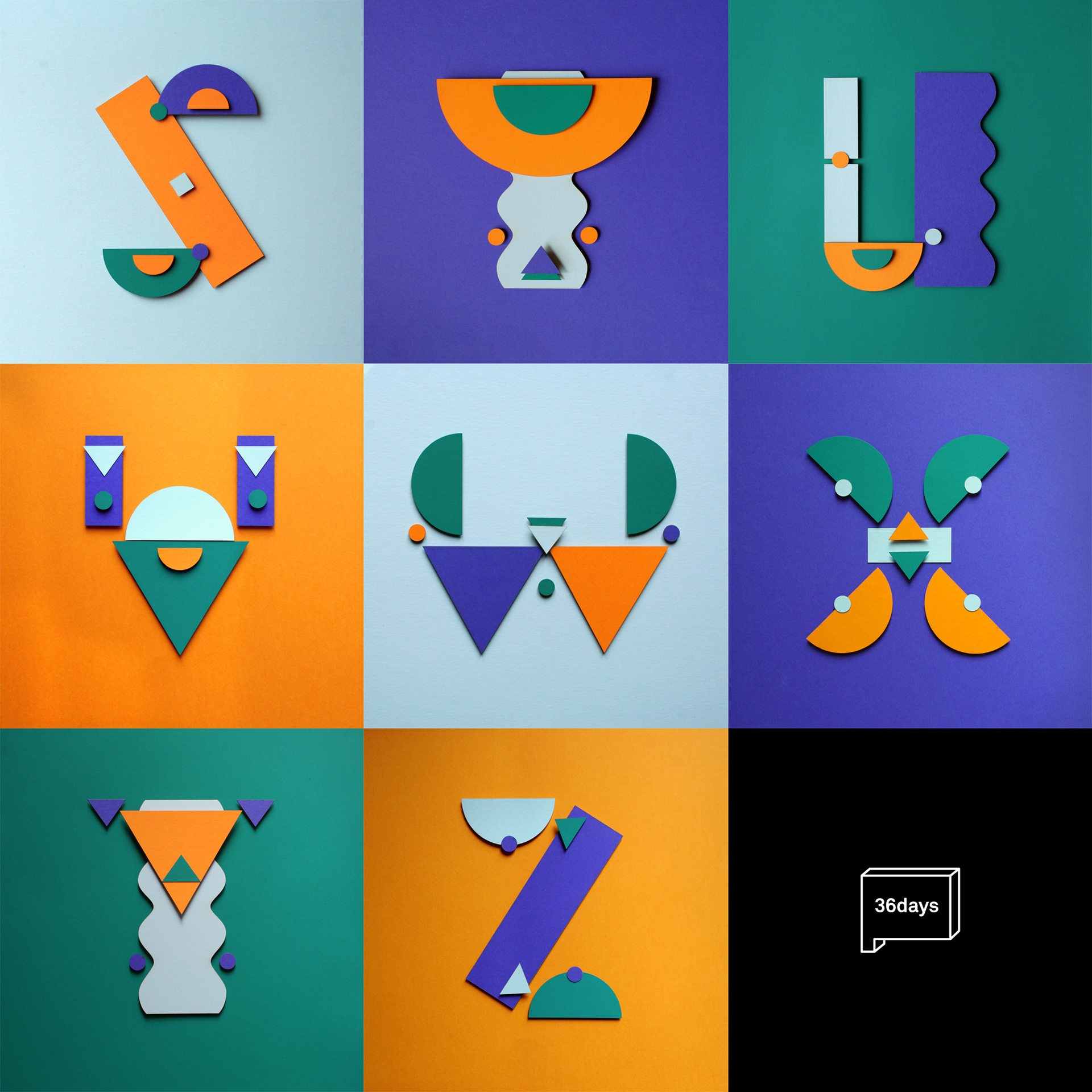With the "36days of type" iniative as a pretext, i develop an alphabet using a limited vocabulary of paper shapes, in four colours. With the shapes used for each letter i create every time a different illustration or composition. That was fun!